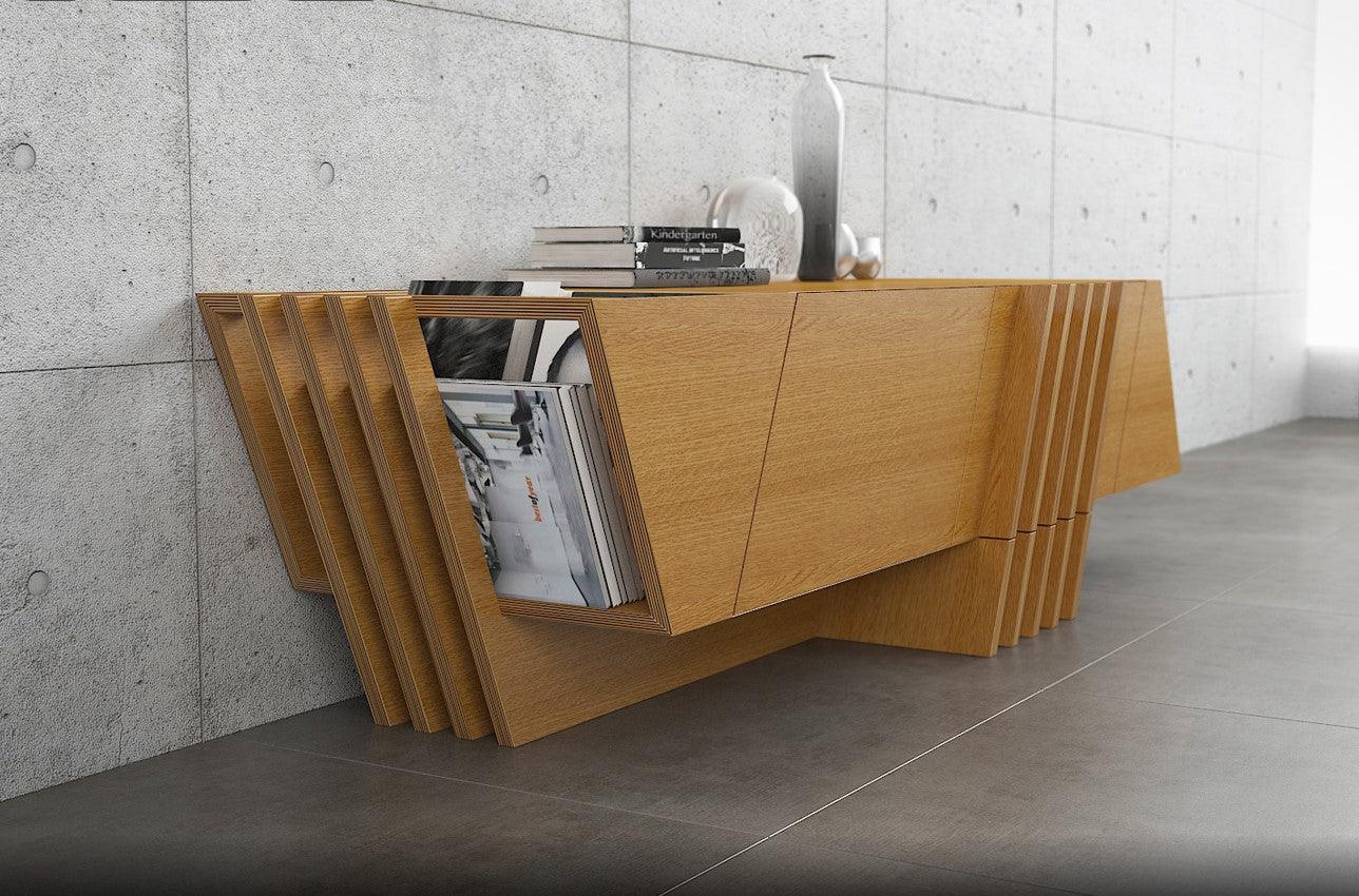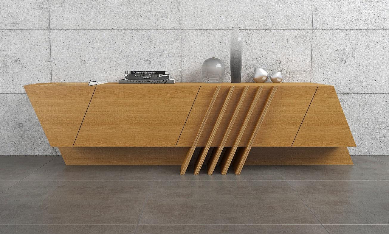 This sideboard - it is transformation of modern architecture forms into furniture design. Dynamic shape makes perception of item more active and creates illusion of motion.
