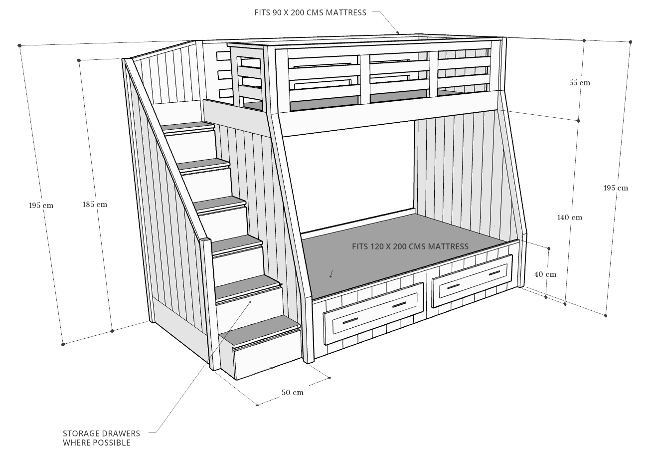 - Bottom Bed fits mattress size: 120 x 200 cms