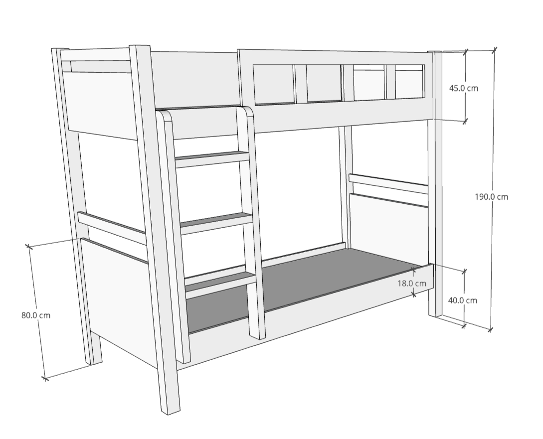 - Bottom Bed fits mattress size: 90 x 200 cms